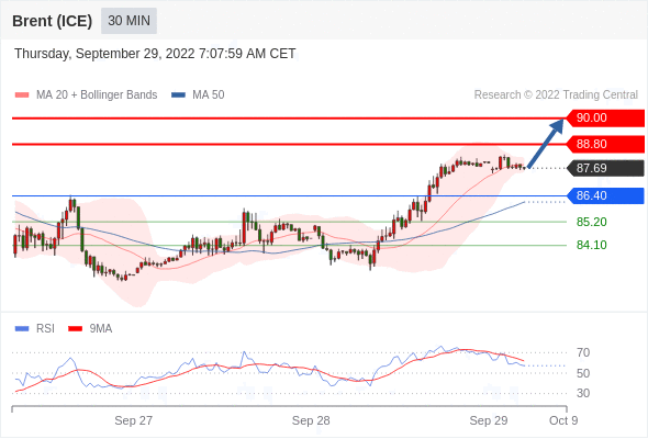布伦特原油 (ICE)? (Z2)? 当日内: 在86.40之上,看涨。