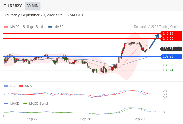欧元/日元 当日内: 看涨,当 139.26 为支撑位,目标定在140.98。