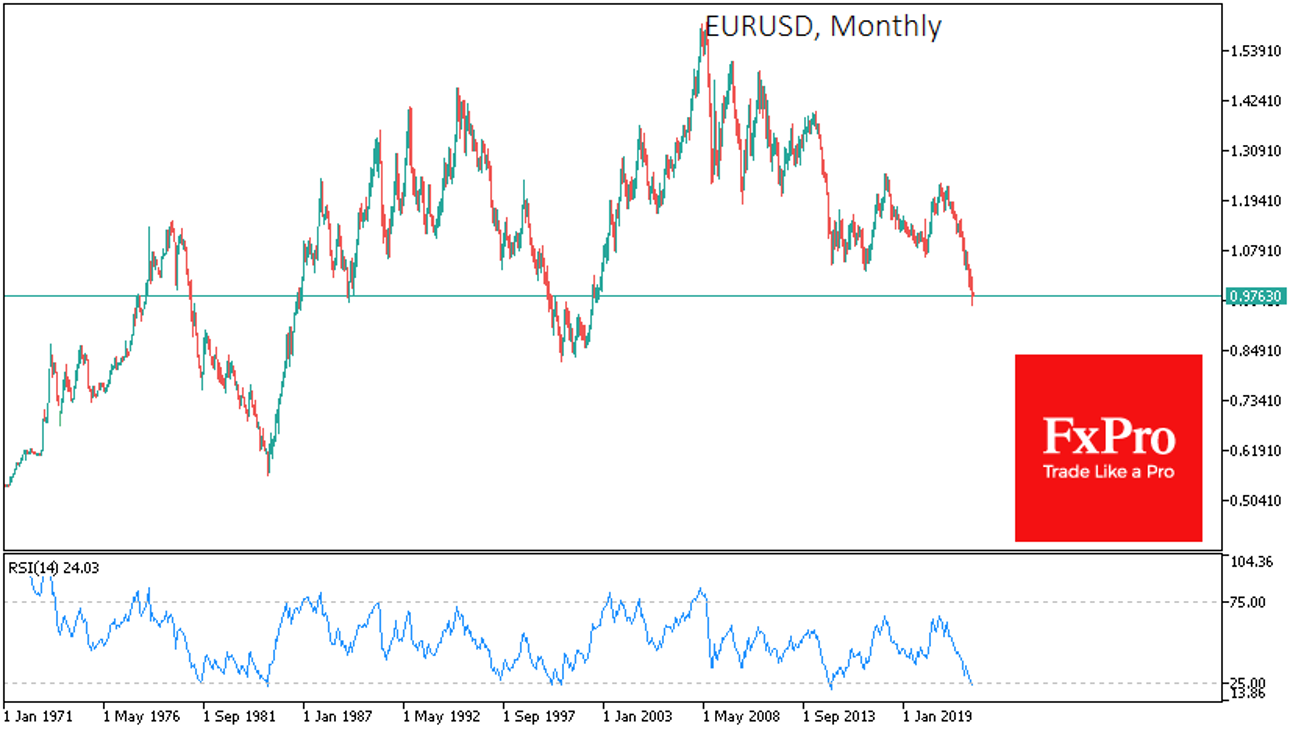 但一个更强烈的信号是月线图上的超卖RSI。该指数本月收于25点以下。在欧元的历史上(包括1971年开始仿效的欧元),该指数曾五次达到如此低的水平,在接下来的一个月里,该指数上升了3.9%,区间为0.8% - 8.2%。