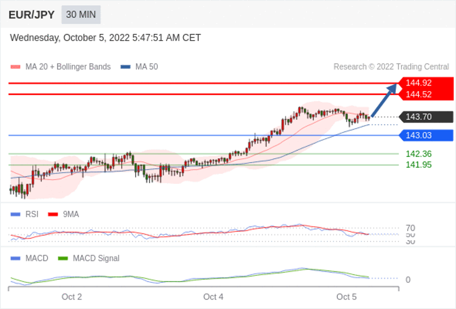 欧元/日元 当日内: 看涨,当 143.03 为支撑位,目标定在144.92。