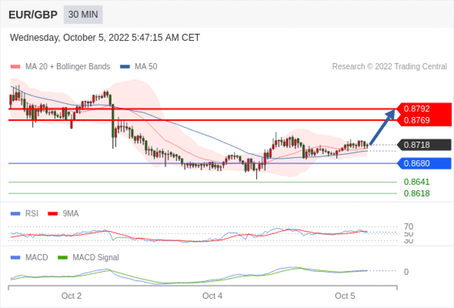 欧元/英镑 当日内: 看涨,当 0.8680 为支撑位。