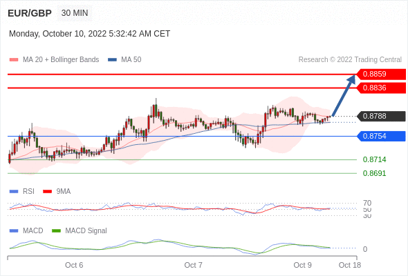 欧元/英镑 当日内: 看涨,当 0.8754 为支撑位,目标定在0.8859。