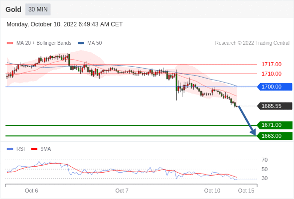 在 1700.00 之下,看跌,目标价位为 1671.00 ,然后为 1663.00 。