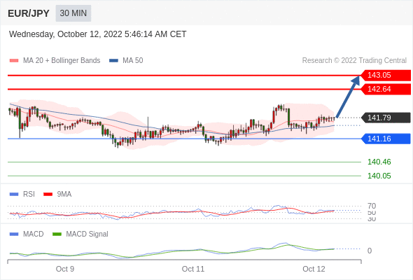 欧元/日元 当日内: 看涨,当 141.16 为支撑位。