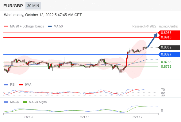 欧元/英镑 当日内: 看涨,当 0.8827 为支撑位。