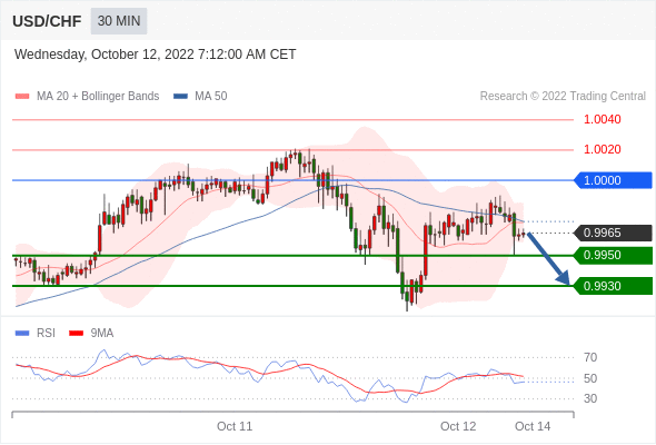 在 1.0000 之下,看跌,目标价位为 0.9950 ,然后为 0.9930 。