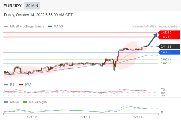 欧元/日元 当日内: 看涨,当 143.63 为支撑位,目标定在145.60。