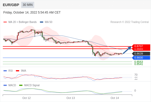 欧元/英镑 当日内: 有上涨的可能,目标价位定在 0.8707 。