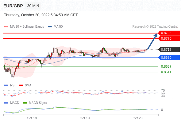 欧元/英镑 当日内: 看涨,当 0.8680 为支撑位。