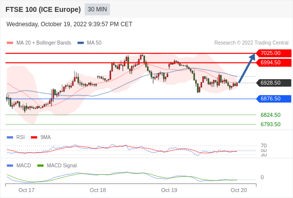 RSI技术指标低于50。 MACD技术指标处在其信号线之上 看空。 此外,价位低于其20个时期及50个时期移动平均线 ( 分别位于 6930.95 和 6949.95 )。