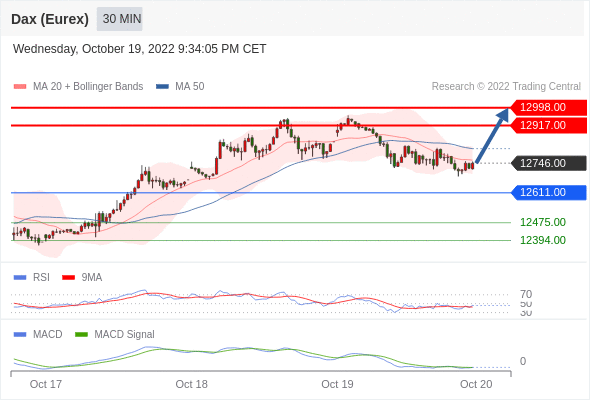 RSI技术指标小于中性区域50。 MACD技术指标呈现看跌状态并 处在其信号线的上方。 此外,价位处在其20个时期及50个时期移动平均线下方 ( 当前是 12759.80 和 12812.06 )。