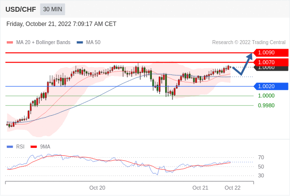 在 1.0020 之上,看涨,目标价位为 1.0070 ,然后为 1.0090 。