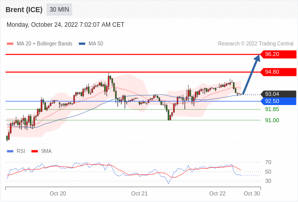 布伦特原油 (ICE)? (Z2)? 当日内: 在92.50之上,看涨。