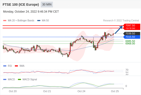 RSI技术指标大于中性区域50。 MACD技术指标呈现看多状态并 处在其信号线的上方。 此外,价位处在其20个时期及50个时期移动平均线上方 ( 当前是 7019.18 和 6997.08 )。