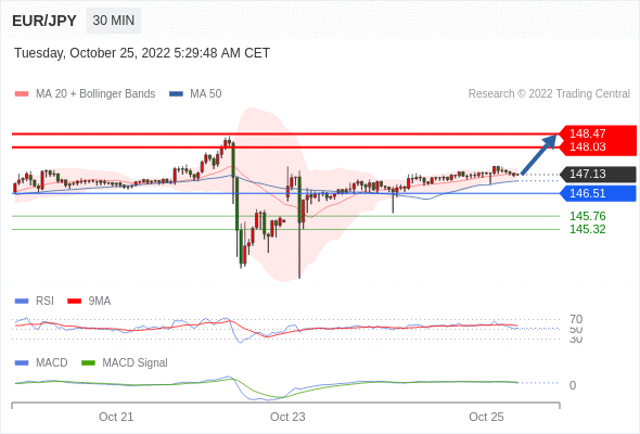 欧元/日元 当日内: 看涨,当 146.51 为支撑位,目标定在148.47。