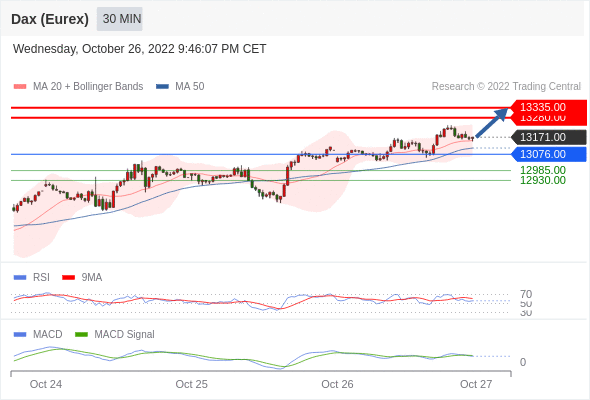 RSI技术指标超过50。 MACD技术指标处在其信号线之下 看多。 此外,价位高于其20个时期及50个时期移动平均线 ( 分别位于 13153.30 和 13110.72 )。