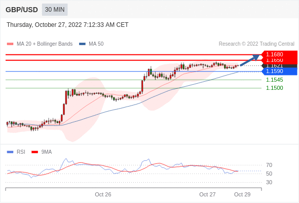 在 1.1590 之上,看涨,目标价位为 1.1650 ,然后为 1.1680 。