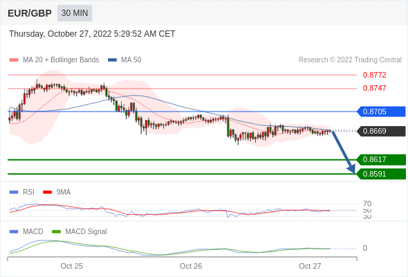 欧元/英镑 当日内: 看跌,在 0.8705 之下。
