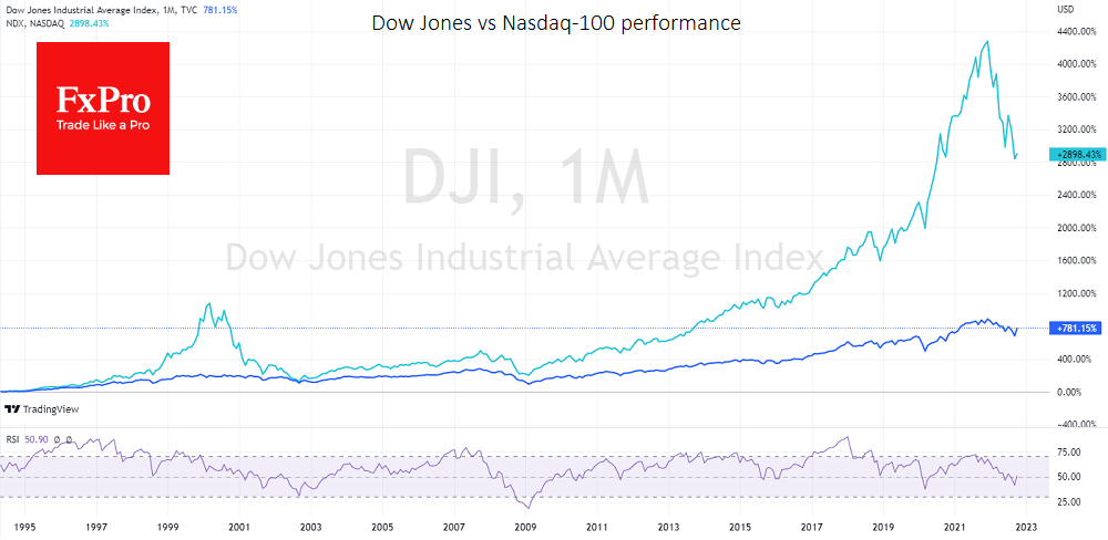 道琼斯指数过去5天上涨4.6%,纳斯达克100指数上涨0.7%。只要货币当局继续采取遏制通胀的政策,而不是像2009年以来那样推高通胀,这种势头上的差异就可能继续存在。