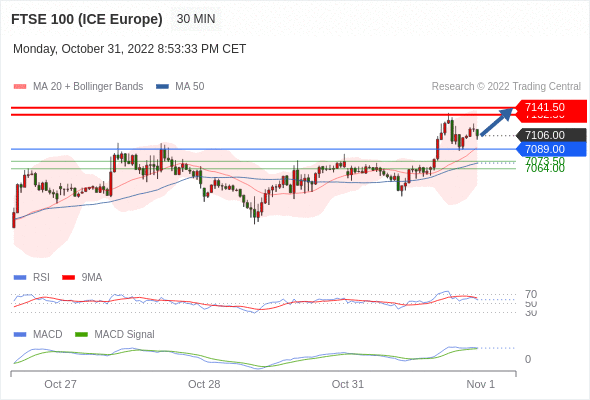 RSI技术指标超过50。 MACD技术指标处在其信号线之上 看多。 此外,价位处在其20个时期及50个时期移动平均线上方 ( 当前是 7090.80 和 7071.22 )。
