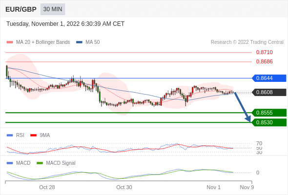 欧元/英镑 当日内: 当 0.8644 维持阻力位时,看跌,目标锁定在 0.8530 。