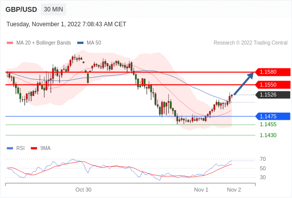在 1.1475 之上,看涨,目标价位为 1.1550 ,然后为 1.1580 。