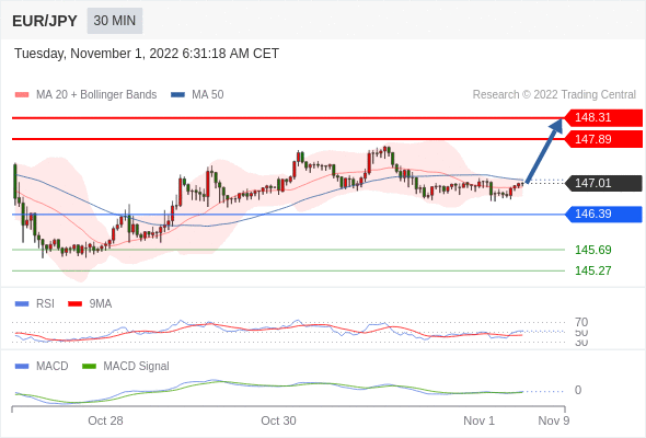 向下跌破 146.39 ,将带来继续下跌的趋势,目标位为 145.69 然后为 145.27 。
