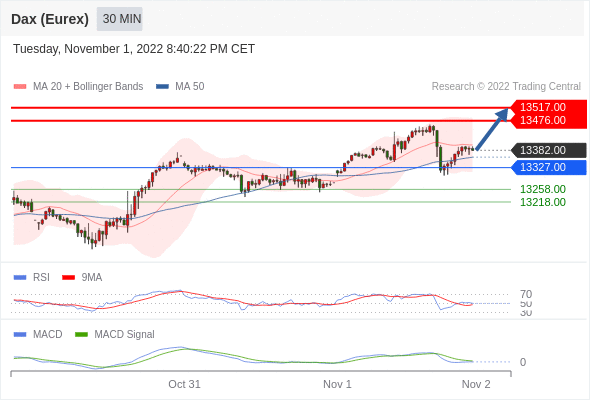 如跌破 13327 ,德国DAX指数期货 (Eurex) 目标方向定在 13258 和 13218 。