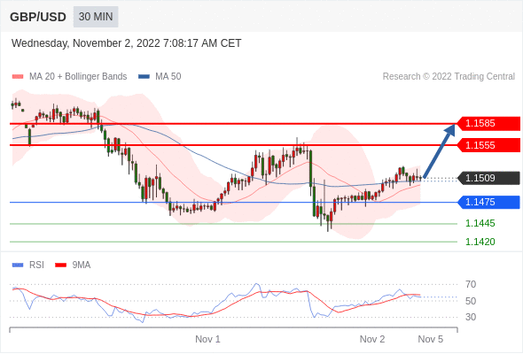 在 1.1475 之上,看涨,目标价位为 1.1555 ,然后为 1.1585 。