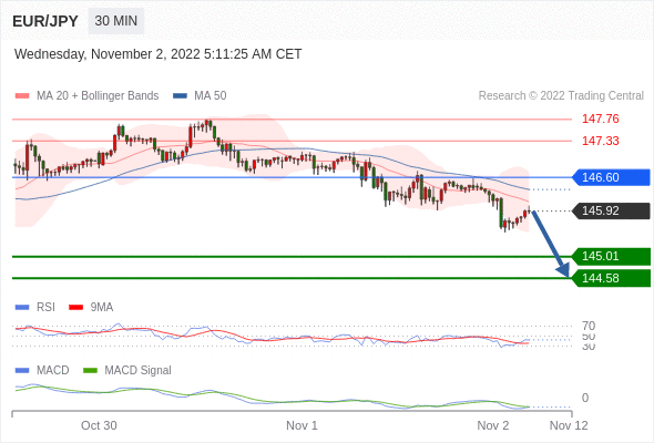欧元/日元 当日内: 看跌,在 146.60 之下。
