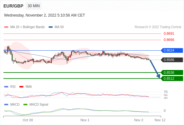 欧元/英镑 当日内: 看跌,在 0.8624 之下。