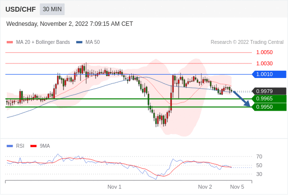 在 1.0010 之下,看跌,目标价位为 0.9965 ,然后为 0.9950 。