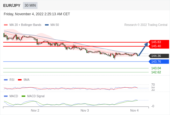 欧元/日元 当日内: 有上涨的可能,目标价位定在 145.83 。