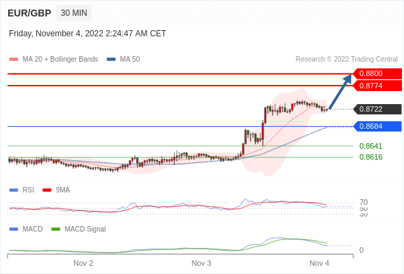 欧元/英镑 当日内: 看涨,当 0.8684 为支撑位,目标定在0.8800。