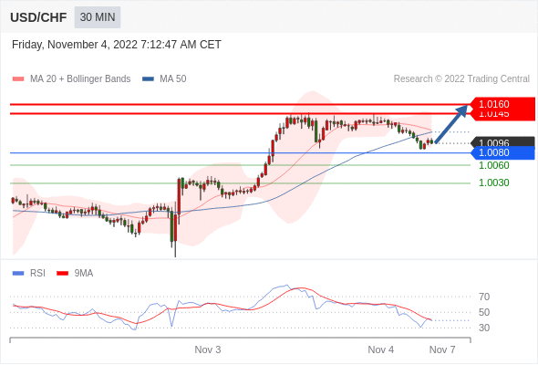 在 1.0080 之上,看涨,目标价位为 1.0145 ,然后为 1.0160 。