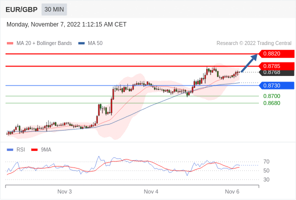 在 0.8730 之上,看涨,目标价位为 0.8785 ,然后为 0.8820 。