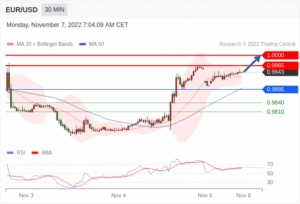 在 0.9885 之上,看涨,目标价位为 0.9965 ,然后为 1.0000 。