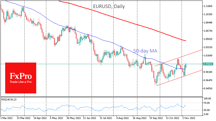 欧元兑美元,主要的货币市场对,正猛攻回平价和50天移动均线上方的区域。 尽管十月份强劲的升势被打破,但作为一系列本地低点和高点上升的升势仍保持不变。