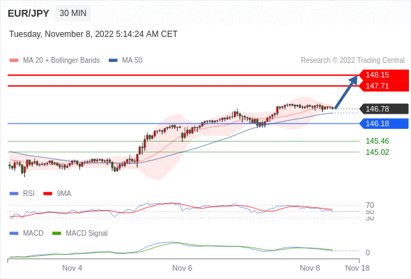 欧元/日元 当日内: 看涨,当 146.18 为支撑位,目标定在148.15。