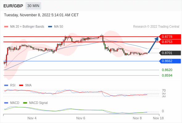 欧元/英镑 当日内: 有上涨的可能,目标价位定在 0.8778 。