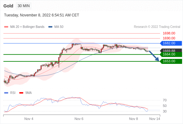 在 1682.00 之下,看跌,目标价位为 1664.00 ,然后为 1653.00 。