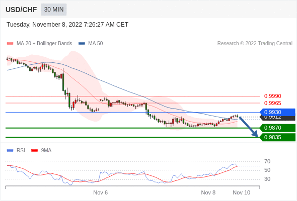 在 0.9930 之下,看跌,目标价位为 0.9870 ,然后为 0.9835 。