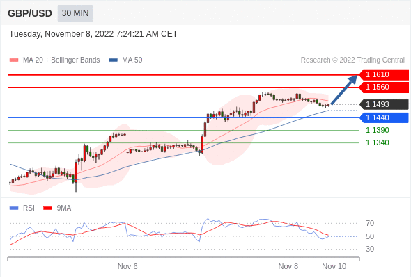 在 1.1440 之上,看涨,目标价位为 1.1560 ,然后为 1.1610 。