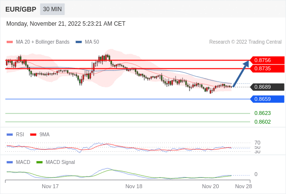 欧元/英镑 当日内: 有上涨的可能,目标价位定在 0.8756 。