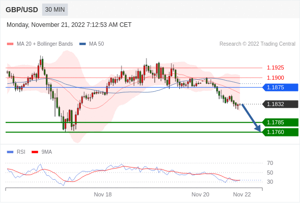 在 1.1875 之下,看跌,目标价位为 1.1785 ,然后为 1.1760 。