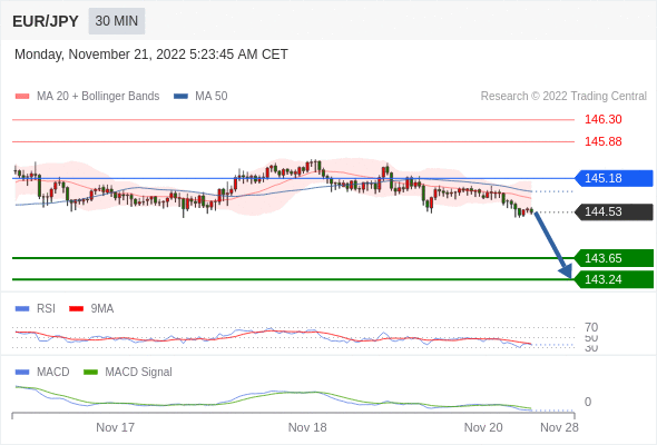 欧元/日元 当日内: 看跌,在 145.18 之下。