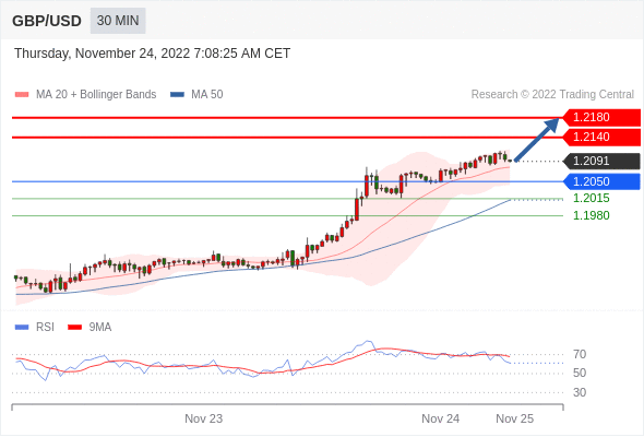 在 1.2050 之上,看涨,目标价位为 1.2140 ,然后为 1.2180 。
