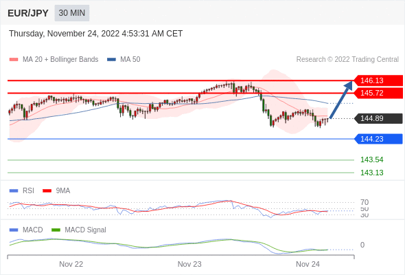 欧元/日元 当日内: 有上涨的可能,目标价位定在 146.13 。
