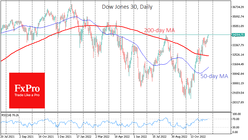 道琼斯30指数是标普500指数和纳斯达克100指数的领头羊,两周来一直在200日均线上方交易,目前正在重写4月份以来的高点,突破了8月份的峰值,这是趋势变化的一个重要信号。 此外,它现在比10月3日创下的低点高出19.9%,预示着熊市的正式结束。