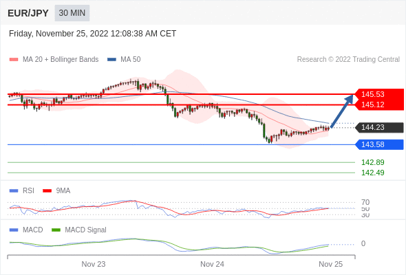 欧元/日元 当日内: 看涨。